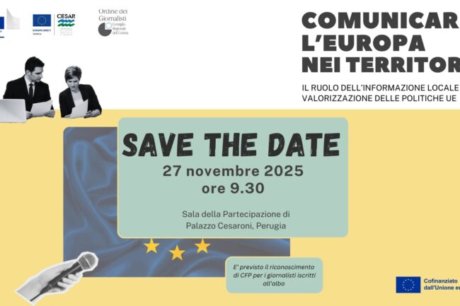 Giovedì 27 novembre 2025 è in programma l’evento sul tema COMUNICARE L’EUROPA NEI TERRITORI: IL RUOLO DELL’INFORMAZIONE LOCALE NELLA VALORIZZAZIONE DELLE POLITICHE UE. L’incontro, organizzato in collaborazione con Ordine dei Giornalisti dell’Umbria e con il supporto dalla Rappresentanza della Commissione europa a Roma, prevede una serie di interventi per fornire ai giornalisti, ma anche ai…