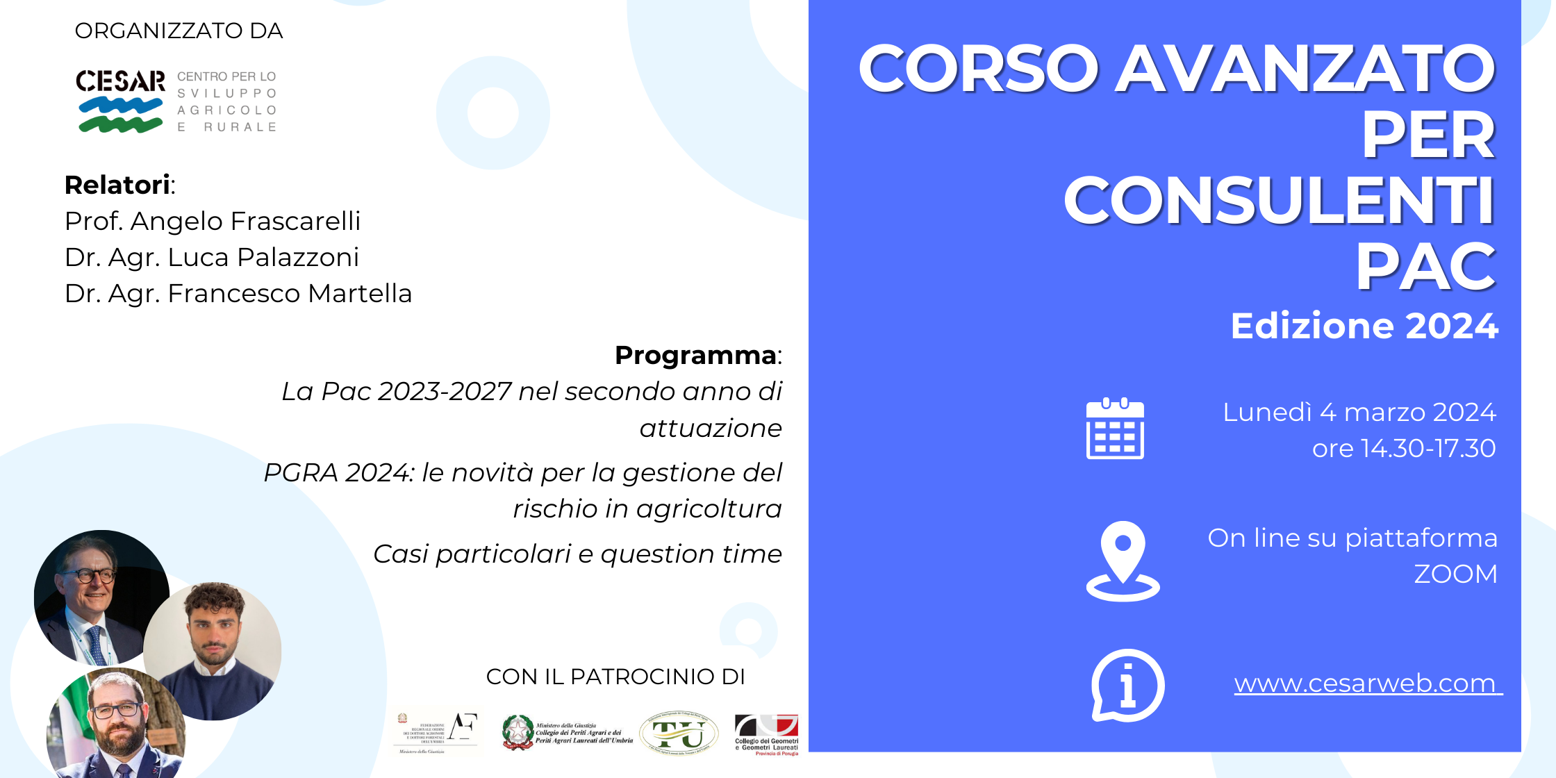 Lunedì 4 marzo, dalle 14.30 alle 17.30, è in programma la I edizione 2024 del CORSO AVANZATO PER CONSULENTI PAC, con il Patrocinio di Federazione Regionale Dottori Agronomi e Dottori Forestali dell’Umbria, Collegio Geometri e Geometri laureati di Perugia, Collegio dei Periti Agrari e dei Periti Agrari Laureati dell’Umbria e Federazione Periti Agrari Toscana Umbria.