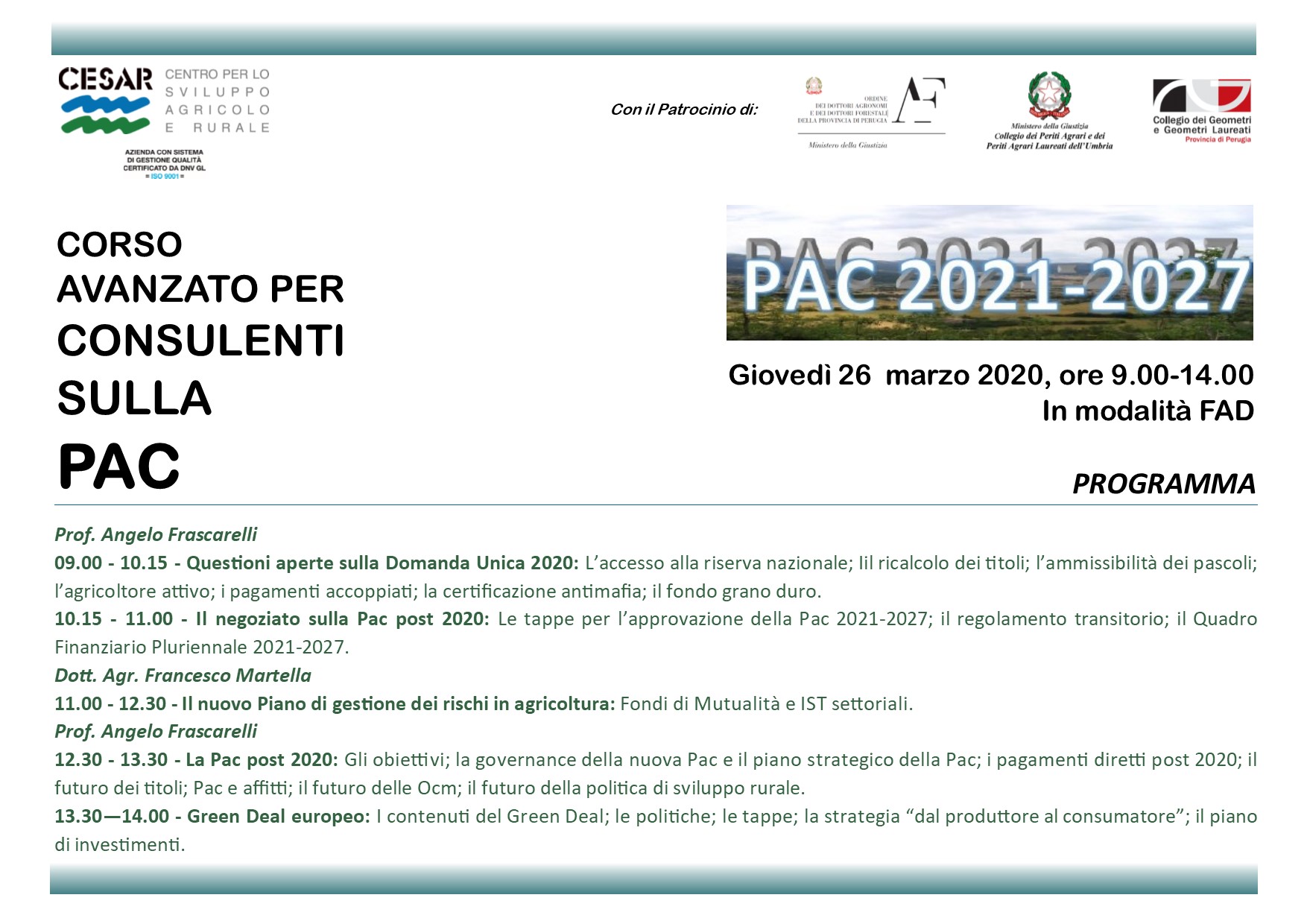 E’ DISPONIBILE ON-LINE IL CORSO DI AGGIORNAMENTO AVANZATO PER CONSULENTI SULLA PAC, con il patrocinio dell’Ordine Dottori Agronomi e Forestali di Perugia, del Collegio Periti Agrari e P.A. Laureati dell’Umbria e del Collegio Geometri e geometri laureati di Perugia.
