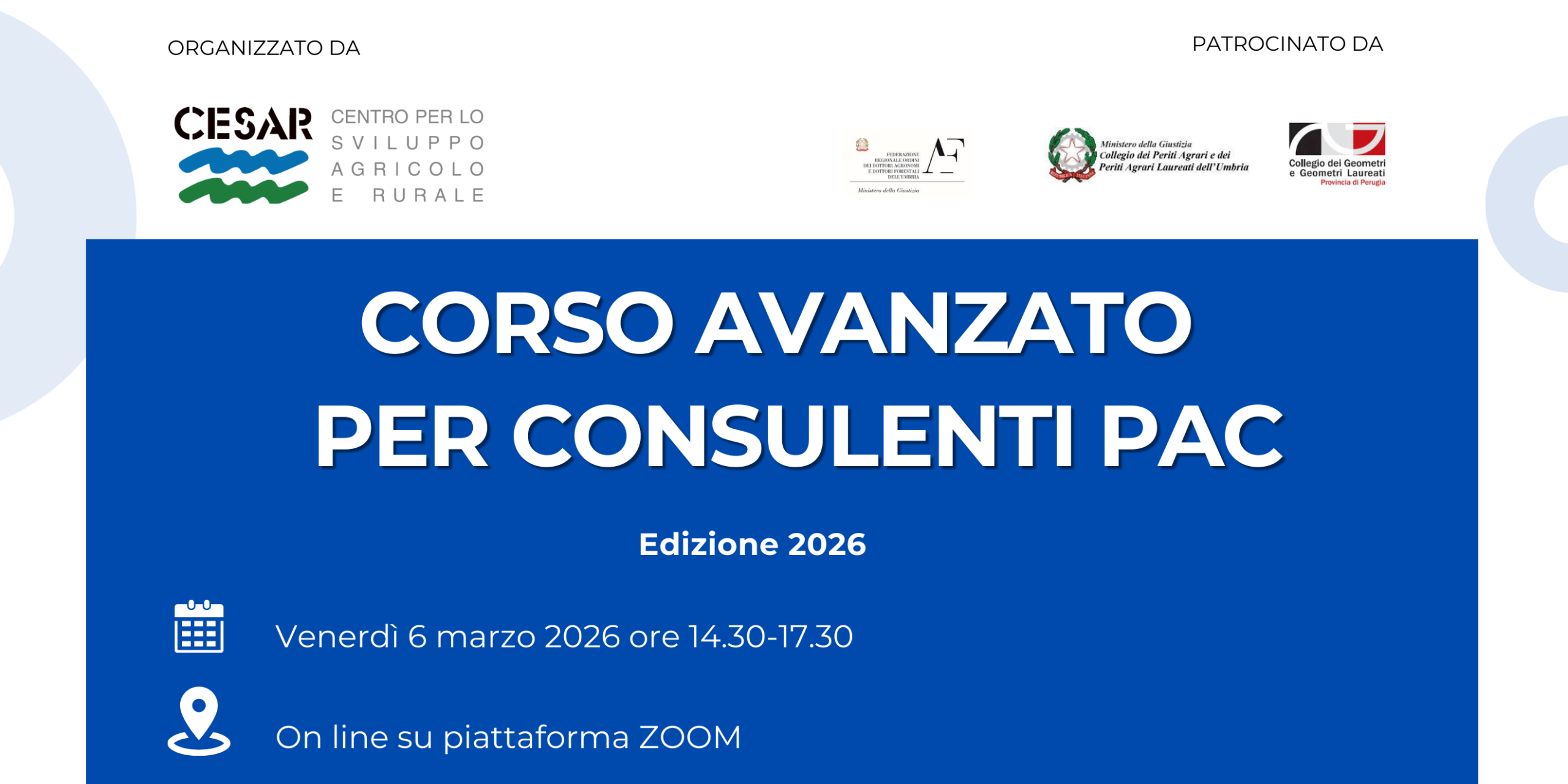 Venerdì 6 marzo 2026, dalle 14.30 alle 17.30, è in programma l’edizione 2026 del CORSO AVANZATO PER CONSULENTI PAC, on line su piattaforma ZOOM.