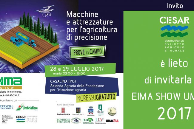 Il CESAR era presente a EIMA Show Umbria 2017, evento dedicato alla dimostrazione dal vivo di macchine ed attrezzature per l’agricoltura di precisione, svoltosi il 28 e 29 luglio presso l’azienda agraria della Fondazione per l’Istruzione Agraria di Casalina di Deruta (PG).